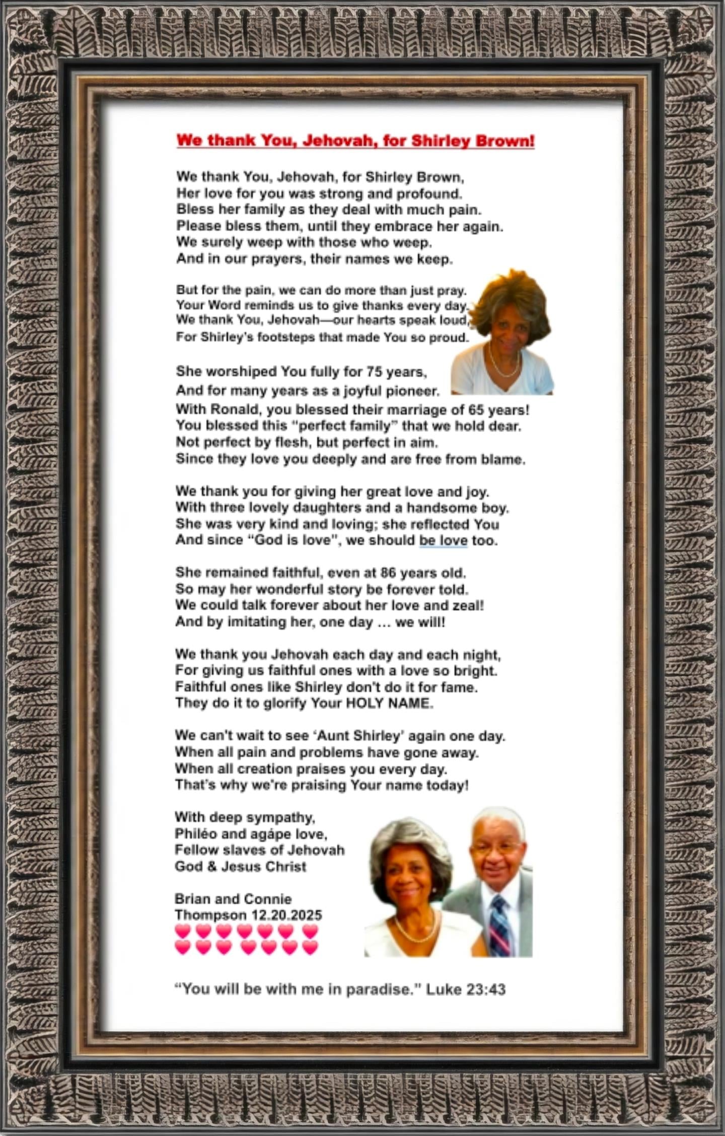One of the words I have always associated with Sister Brown is grace. She carried a graceful elegance—one that was evident not only in the spiritual activities we shared, but also in the way she lived her daily life. In her own way, she left a lasting impression on those who had the privilege of knowing her, and it is easy to see that same grace and strength reflected in her family.